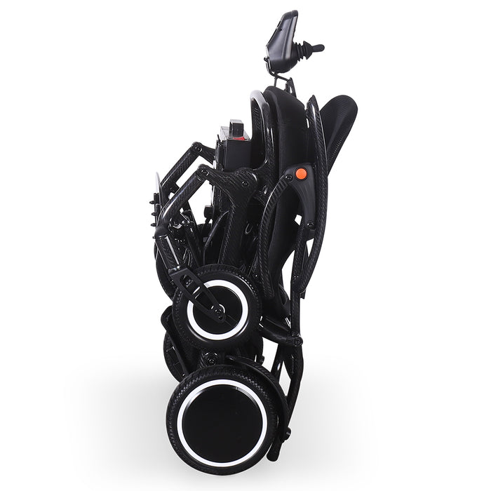 Constructed entirely from ultra-strong, ultra-light carbon fibre, the ExoGlide weighs just 14kg (without battery), making it one of the lightest powered wheelchairs in its class. Folding is quick and effortless thanks to a streamlined mechanism that collapses the chair in seconds. Its feather-light frame makes lifting into a car boot or storage space easy — perfect for solo travellers or everyday convenience.